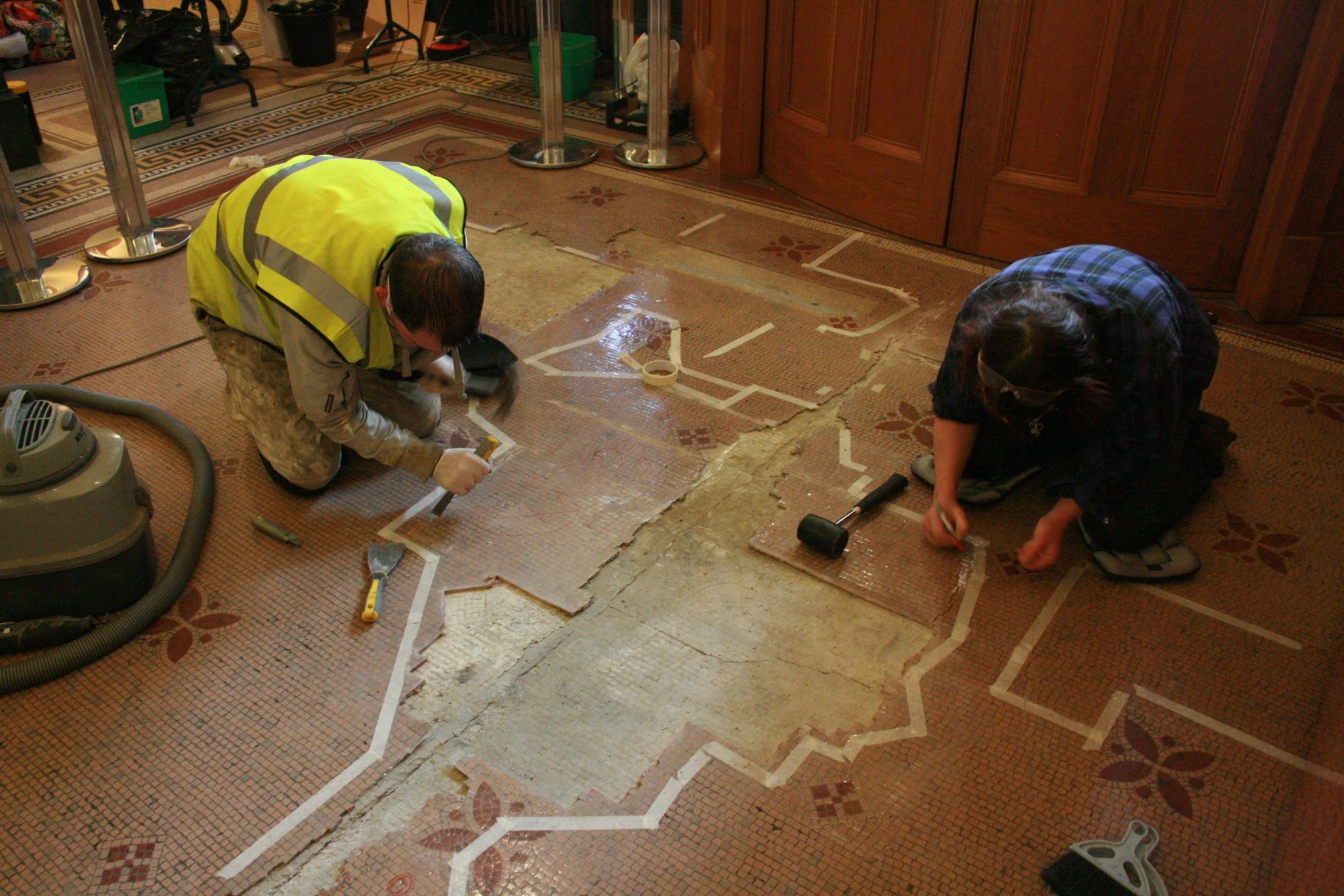 Opus Mosiac was commissioned in 2014 as part of a programme of refurbishment works. The mosaic floors of the entrance foyer were unstable, with significant separation from the mortar bed, and considerable risk of loss.